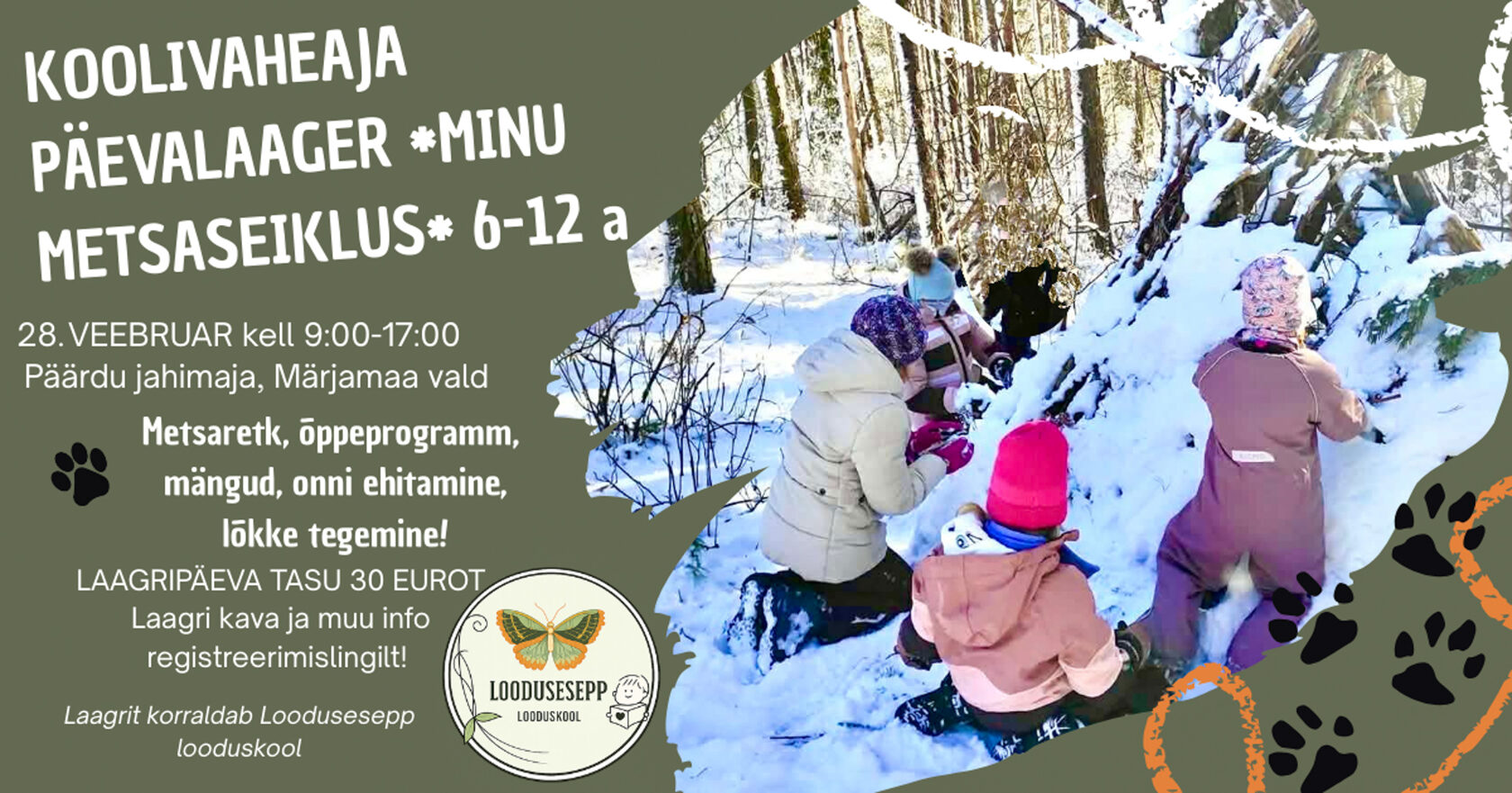 Pakume loodusretki lasteaia- ja koolilastele kokkulepitud looduspaigas, kus õppimine toimub läbi õppemängude ja vahetu looduskogemuse. Soovi korral teeme koos lõkke, vajadusel pakume ka toitlustust, et päev looduses oleks mõnus ja murevaba. Päevalaagrid toimuvad erinevates paikades koolivaheaegadel lastele vanuses 6-12 aastat.